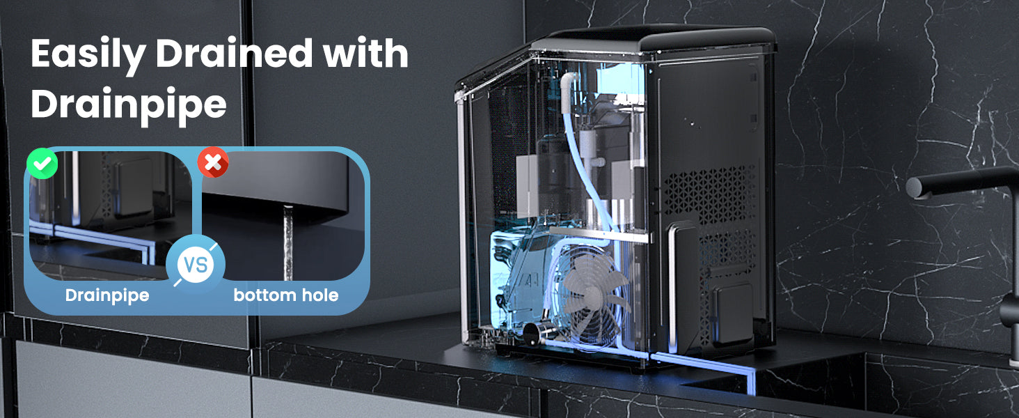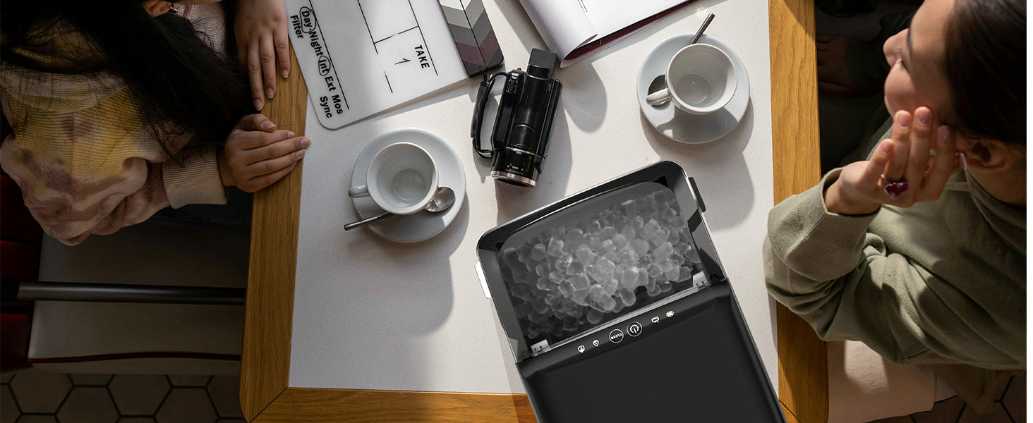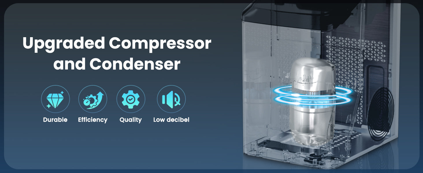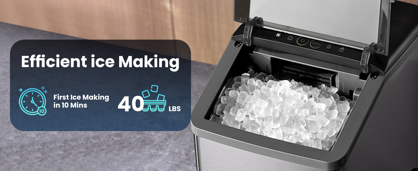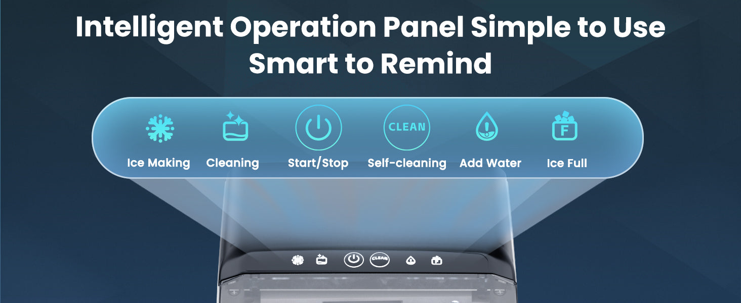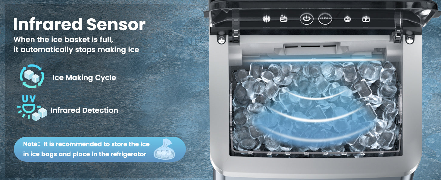 Das Infrarot-Touchpanel zeigt in Echtzeit an, wann Wasser nachgefüllt werden muss und wann der Eisvorrat voll ist. Der abnehmbare Eiskorb fasst bis zu 1,1 kg Eis. Der 1,8-Liter-Wassertank ermöglicht eine längere Eisproduktion ohne ständiges Nachfüllen.