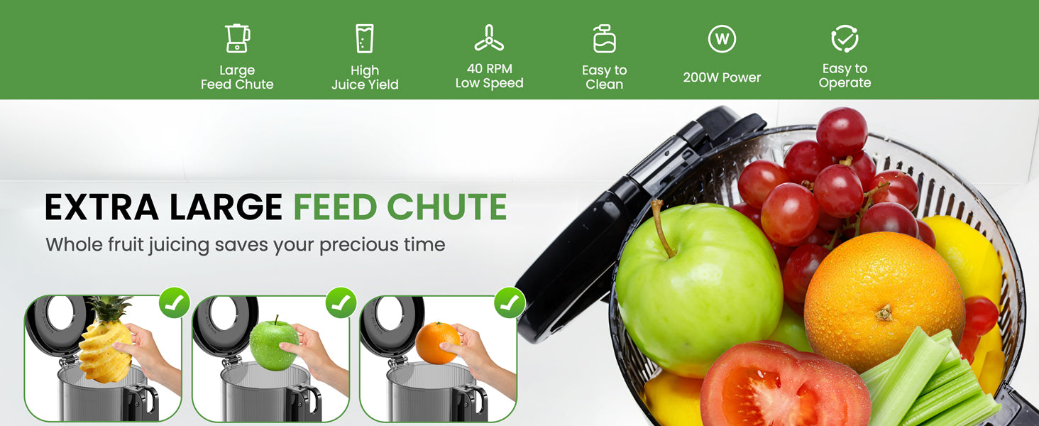 Entsaften ganzer Früchte : Der Einfüllbehälter mit 4,35 Zoll Durchmesser ermöglicht das Entsaften ganzer Früchte, sodass das Zerkleinern der Früchte nicht mehr nötig ist, was für mehr Komfort sorgt.