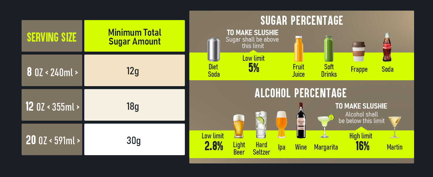 More than slushies! Make juice slush, soda slush, smoothies, milkshakes, low-alcohol cocktails, and more. Sugar-based drinks work best for freezing.