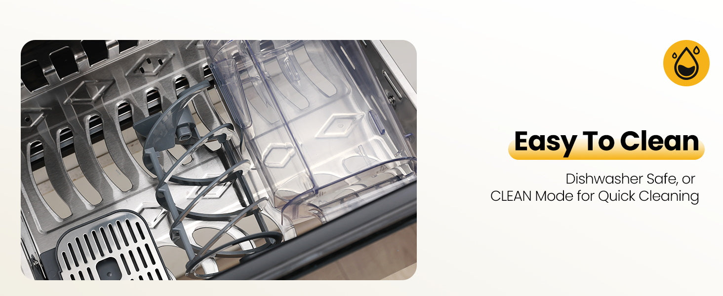 Activate the CLEAN mode after use with just water, or use the included cleaning brush for any residue. All removable parts are dishwasher-safe for added convenience.