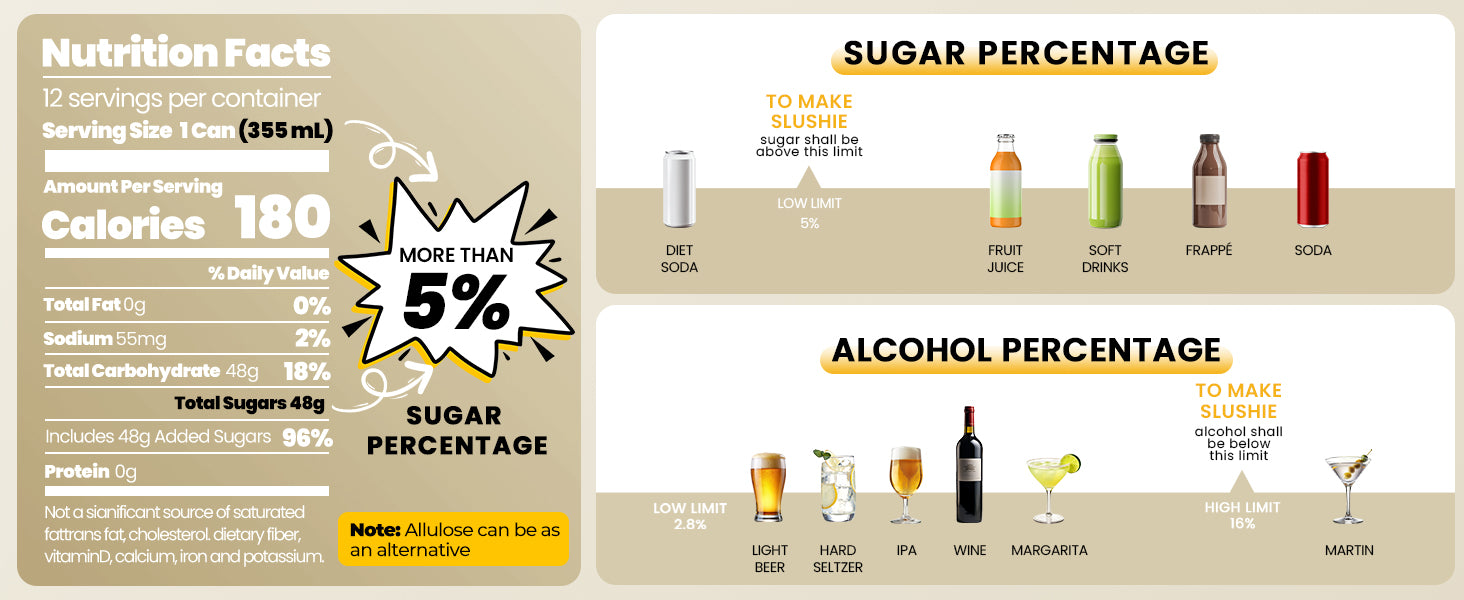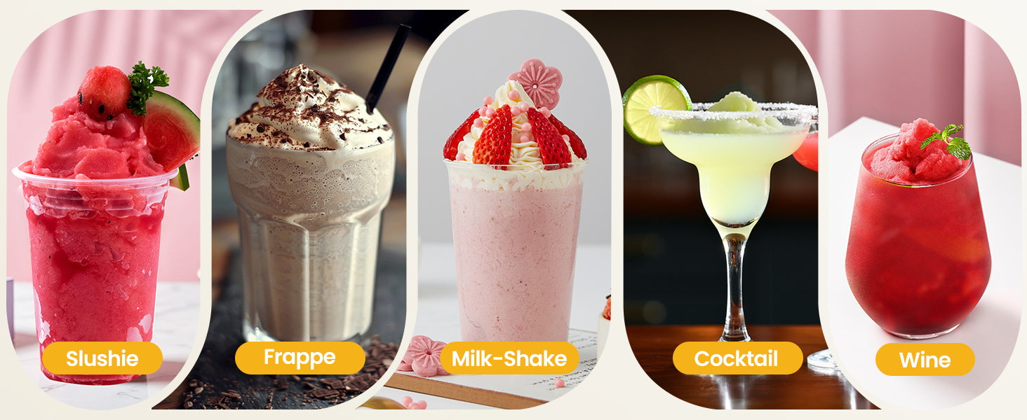 More than slushies! Make juice slush, soda slush, smoothies, milkshakes, low-alcohol cocktails, and more. Sugar-based drinks work best for freezing.